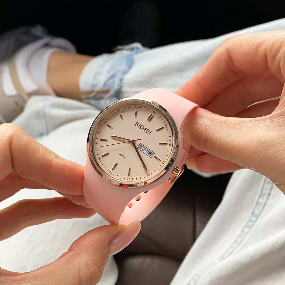 Este reloj Skmei es la opción perfecta para quienes buscan un accesorio funcional y con estilo. Su diseño moderno y sencillo presenta una esfera clara con índices dorados que facilitan la lectura de la hora. La correa de silicona rosa, suave y cómoda, ofrece un ajuste perfecto y una sensación ligera en la muñeca, ideal para el uso diario.